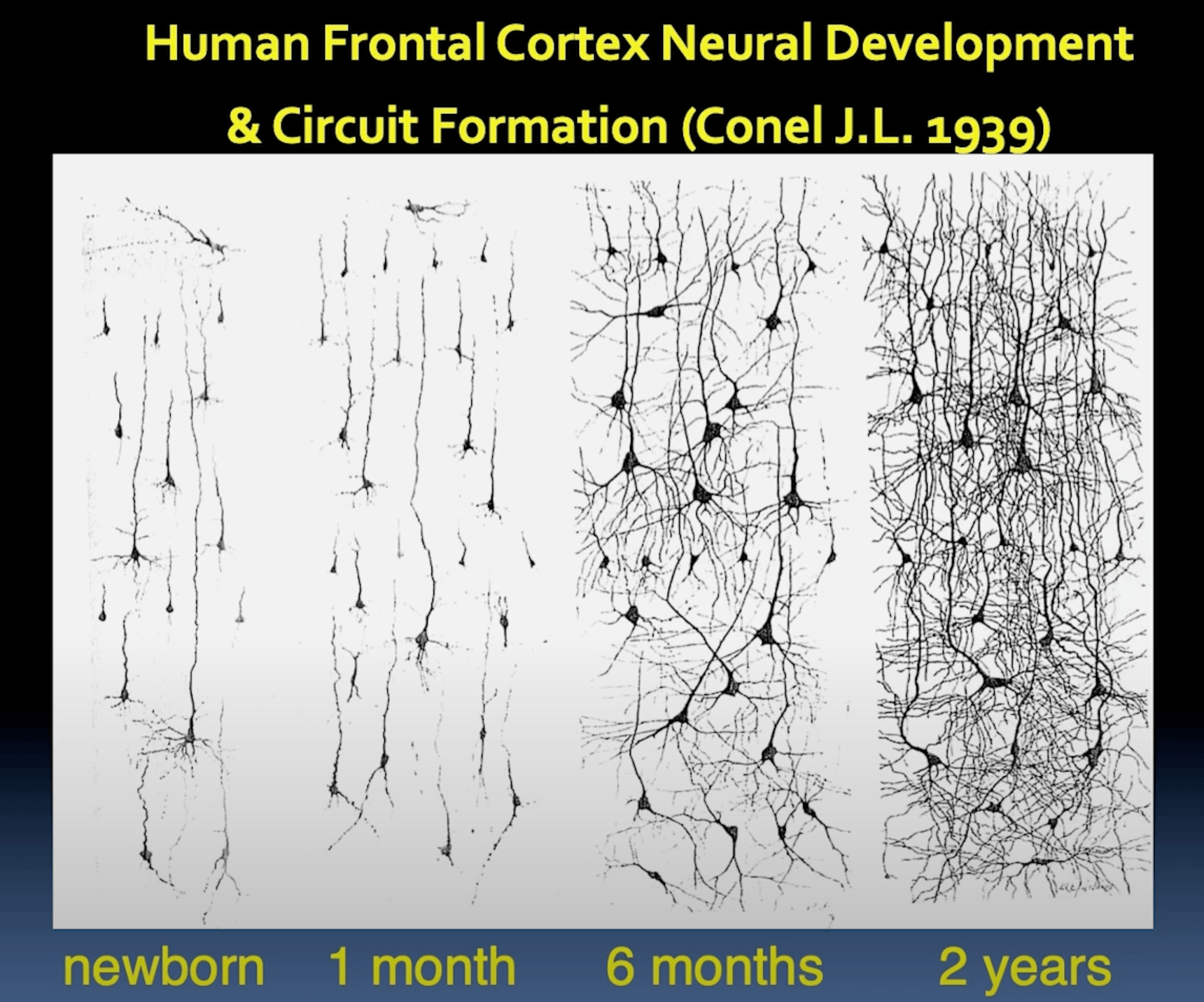 Dr. Karen points out that the plasticity of our brain decreases with change. It means that Our ability to change and resculpt Neuro-Connections decreases with age. The frontal cortex neural circuitry, which governs social interaction, speech, and language, undergoes critical development from birth to about two years of age. |