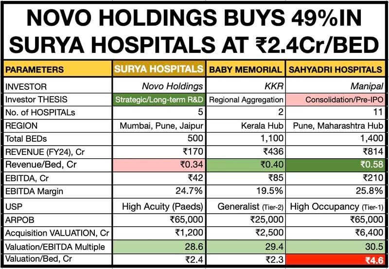 Novo Holdings bought 49% in Paediatric-heavy Surya Hospitals India at ₹1200Cr valuation (₹2.4Cr/Bed).