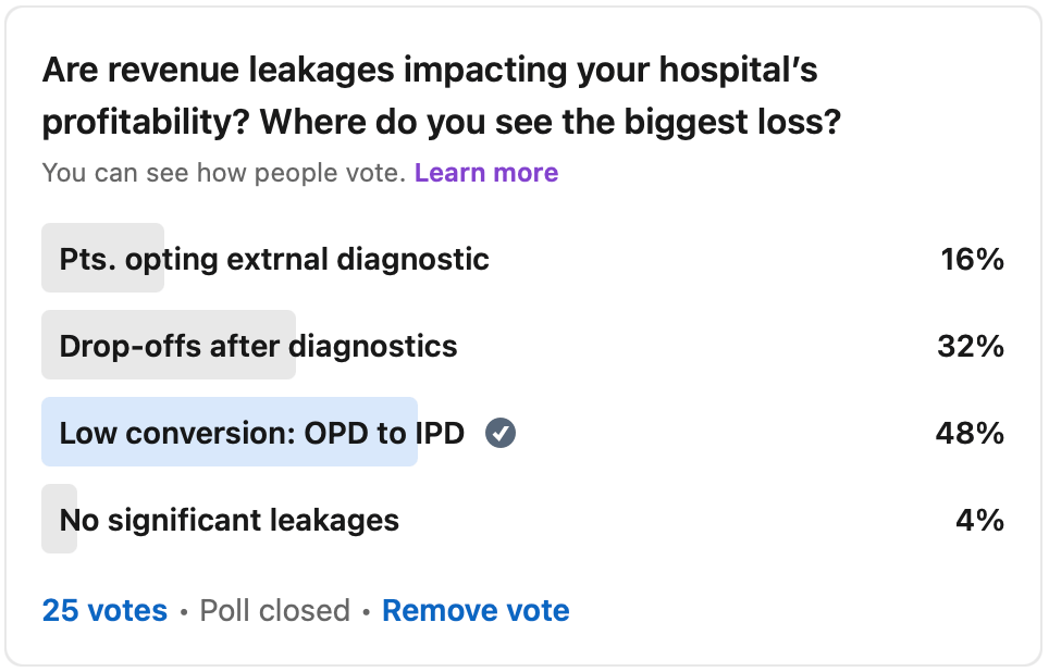 This survey points out that most of the Doctors & Healthcare Professionals (HCPs) understand instinctively where exactly is the Revenue getting leaked with 32% feeling that patients do not visit after Diagnostics for further inspection.